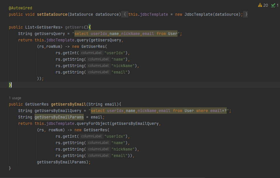 String getUserByEmailQuery = "select userIdx, name, nickName, email from User where email=?";