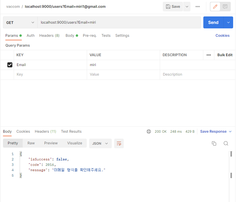 value를 이메일 형식에 맞게 보내지 않았을 때는 에러코드가 다르게 나온다.