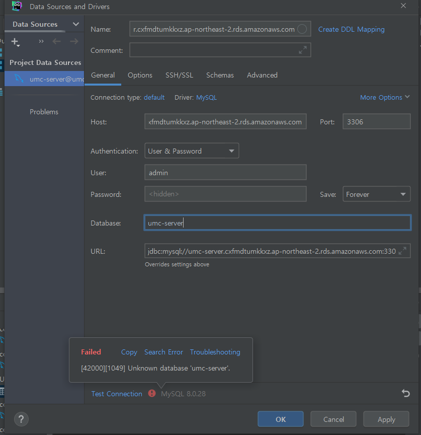 2. database 이름을 설정하지 않은 상태였는데(datagrip에 database를 빈칸으로 설정)