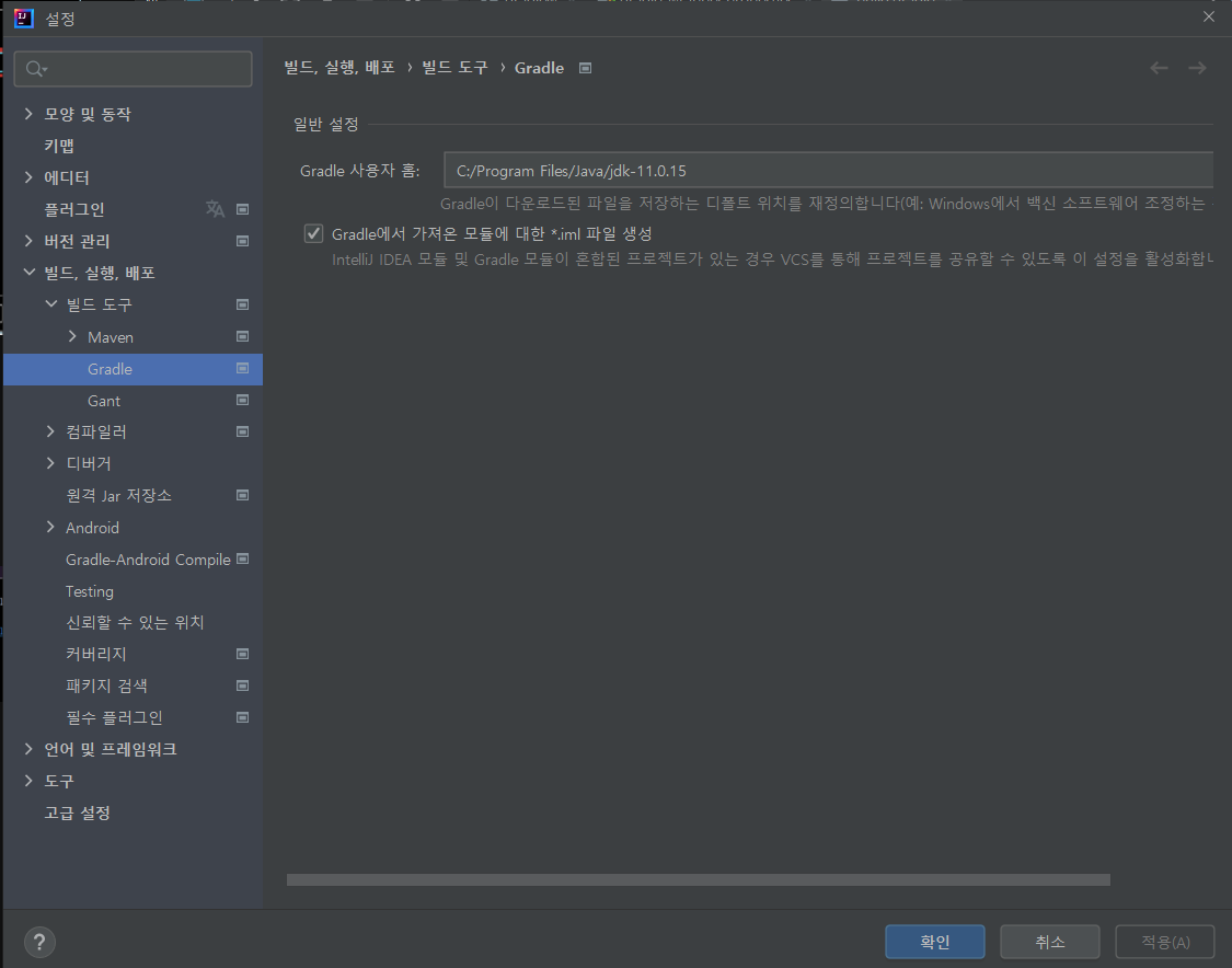 인텔리제이 초기 설정, jdk 15로 적용해보라는 답변을 보고 시도해보았는데 성공했다!!