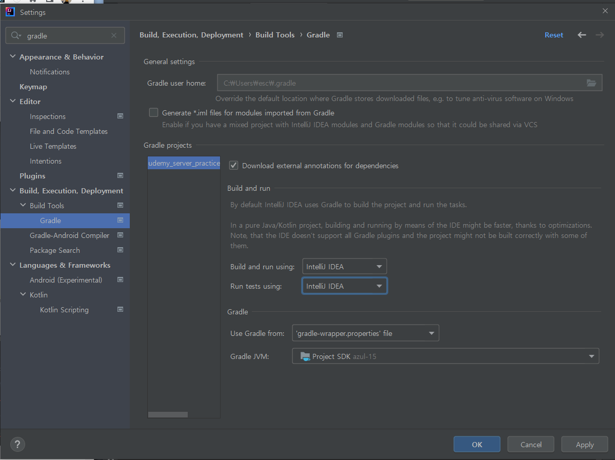 build and run using과 run tests using 부분을 intelliJ IDEA로 바꿔주면 된다는 방법을 보고 바꿔주었지만 해결되지 않음