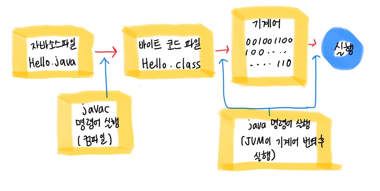- 자바 프로그램은 완전한 기계어가 아닌, 바이트 코드 파일(.class)로 구성된다