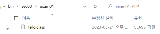 자동 컴파일된 바이트 코드 파일은 파일 디렉토리 bin 폴더 내부에 패키지 폴더(sec03\exam01)와 함께 Hello.class로 생성된다