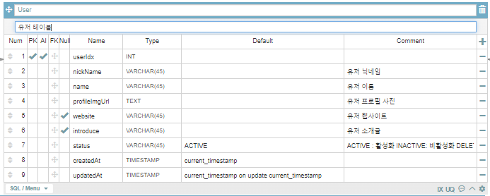 -PK : UserIdx(INT타입 사용)