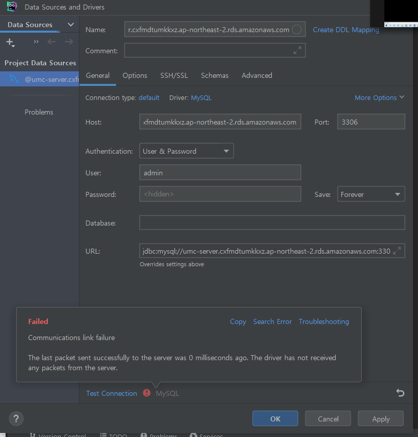 다른 작업을 하려고 aws-rds 포트번호를 9000번을로 바꿔놨었다