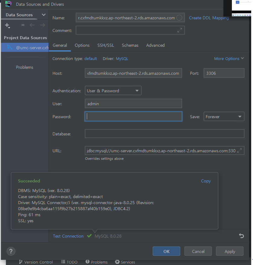 Password에 rds 생성 시 설정했던 Password(수정으로 변경가능)