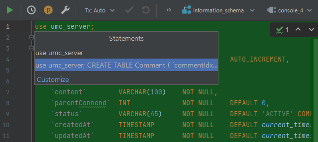 복사해서 datagrip query console에 붙여넣기 후 실행
